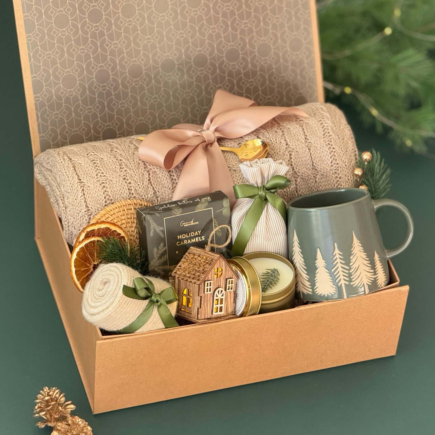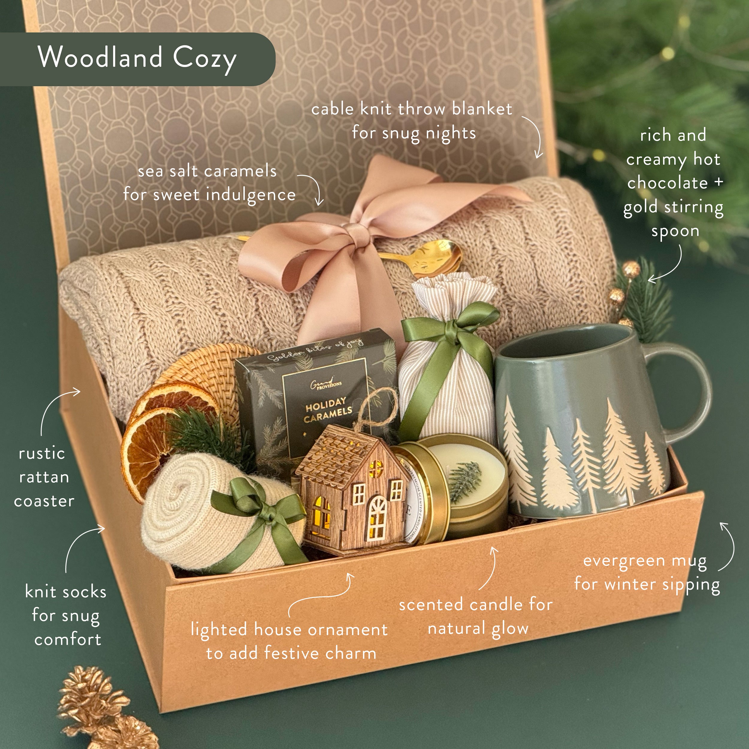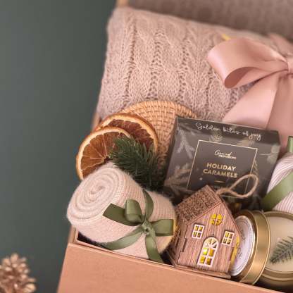 Wrap yourself or a loved one in the warmth of the season with the Woodland Cozy Gift Box �� a beautifully curated holiday set inspired by rustic charm and the peacefulness of winter forests. This luxurious box includes a soft cable-knit throw, a ceramic evergreen mug, creamy holiday caramels, and nature-inspired accents that evoke the spirit of hygge living. Every detail �� from the satin ribbon to the handcrafted touches �� is designed to bring comfort, sweetness, and serenity to chilly winter days. Perfect for slow mornings, fireside evenings, or thoughtful seasonal gifting.