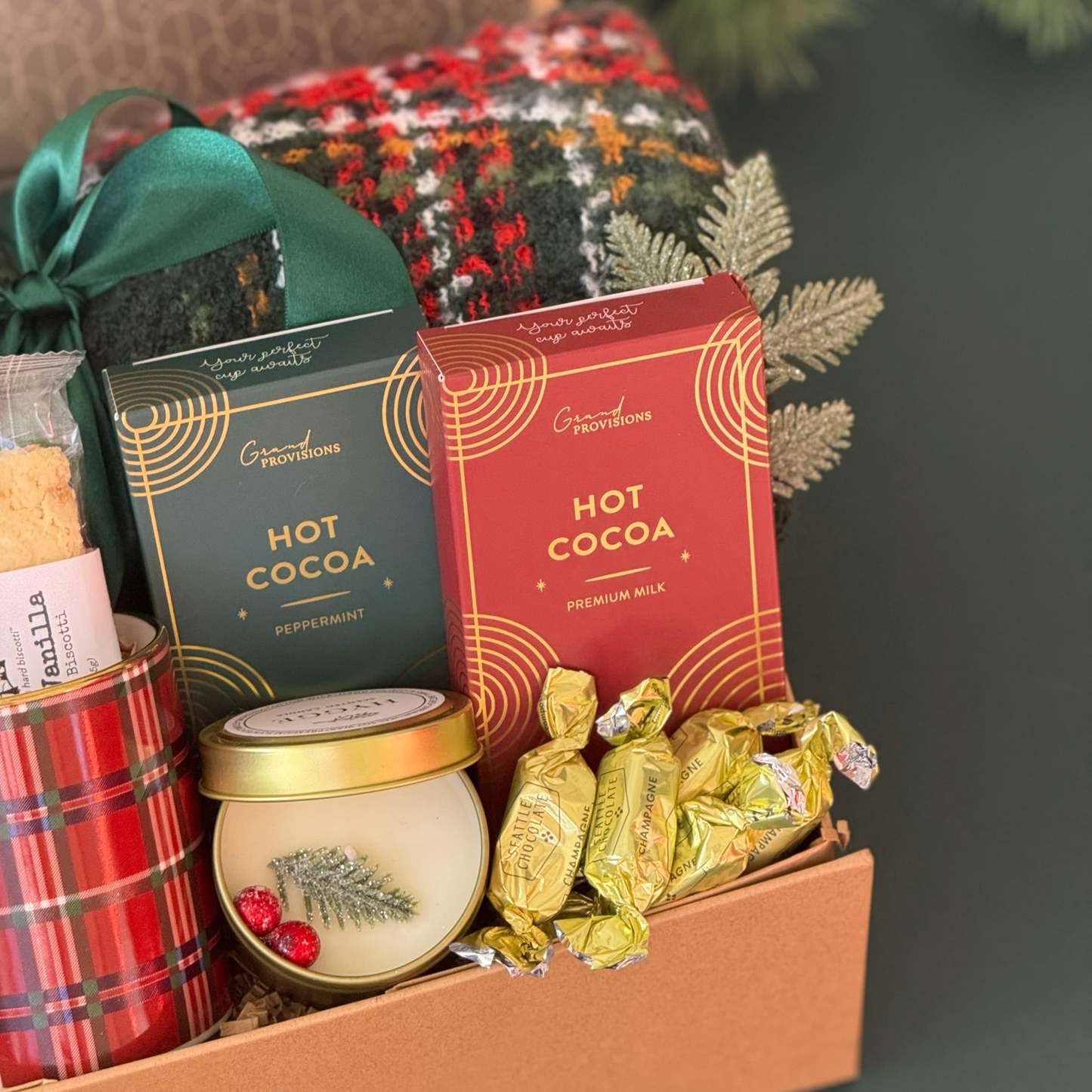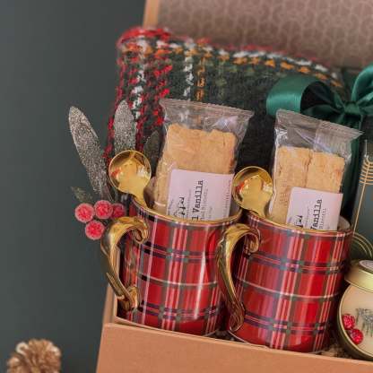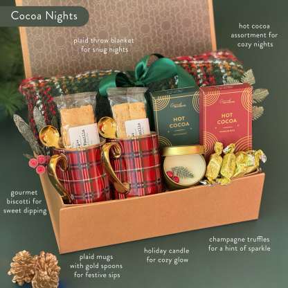 Wrap yourself in warmth and festive charm with the Cozy Cocoa Nights Gift Box �� the ultimate holiday gift set for couples or families who love cozy winter evenings. This beautifully curated Christmas gift box includes everything for a perfect night in: rich artisan hot cocoa, buttery vanilla biscotti, gold-handled plaid mugs, and a soft throw blanketto snuggle up by the fire. Thoughtfully packaged with ribbon and seasonal accents, it��s a ready-to-gift holiday favoritethat captures the spirit of hygge comfort and joy.