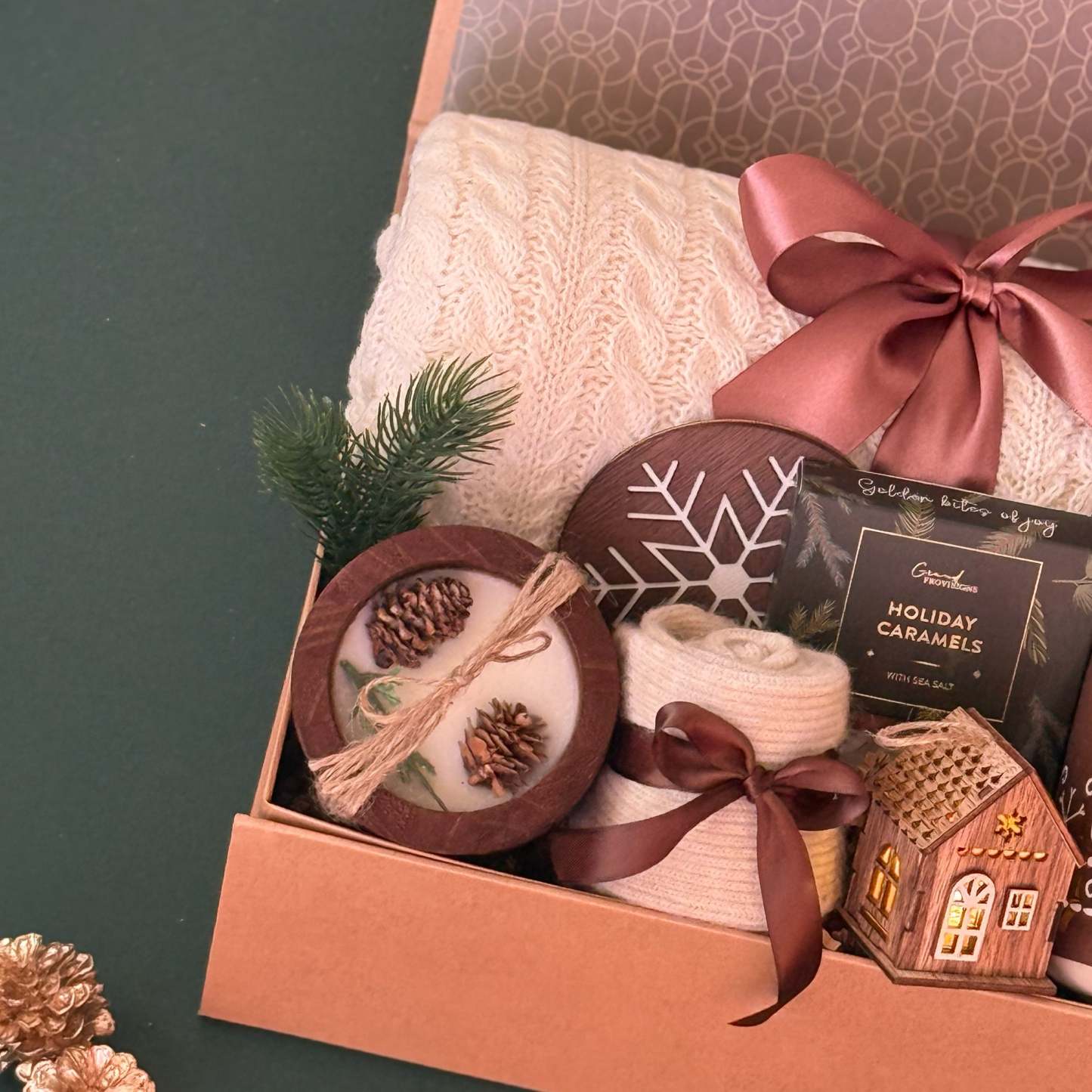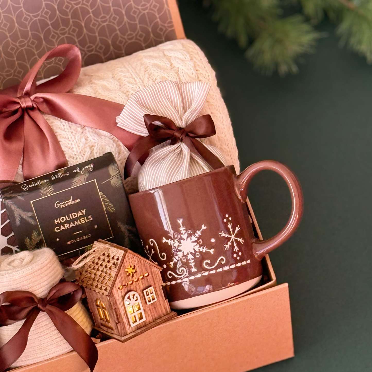 Bring the cozy charm of the season home with the Winter Comfort Gift Box �� a luxurious holiday set designed for warmth, relaxation, and a touch of rustic elegance. Featuring a soft knit throw, artisan holiday caramels, a snowflake mug, and nature-inspired candles, this gift box captures the essence of hygge living. Beautifully packaged with satin ribbon and festive accents, it��s the perfect Christmas gift for her, couples, or families who love slow winter moments and cozy nights by the fire.