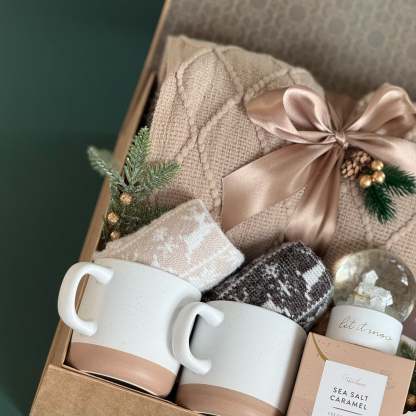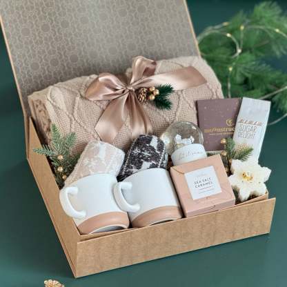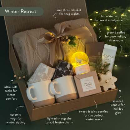 Celebrate cozy winter moments with the Winter Retreat Gift Box �� a thoughtfully curated collection designed for warmth, comfort, and a touch of festive magic. This elegant holiday set features everything needed for slow mornings and peaceful evenings: a soft cable-knit blanket, two ceramic mugs, artisan espresso dark chocolate, and rich ground coffee for the perfect winter brew. Paired with sea salt caramel cocoa cookies, cozy socks, and a snowflake candle, each detail evokes the feeling of hygge living. Finished with a charming ��Let It Snow�� snow globe and satin ribbon, it��s a gift that wraps anyone in seasonal serenity and golden glow.