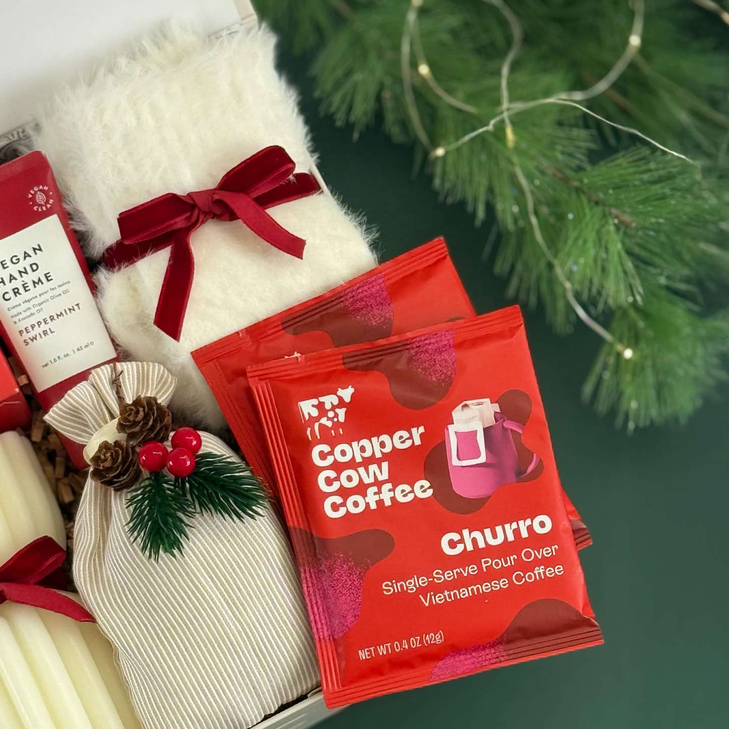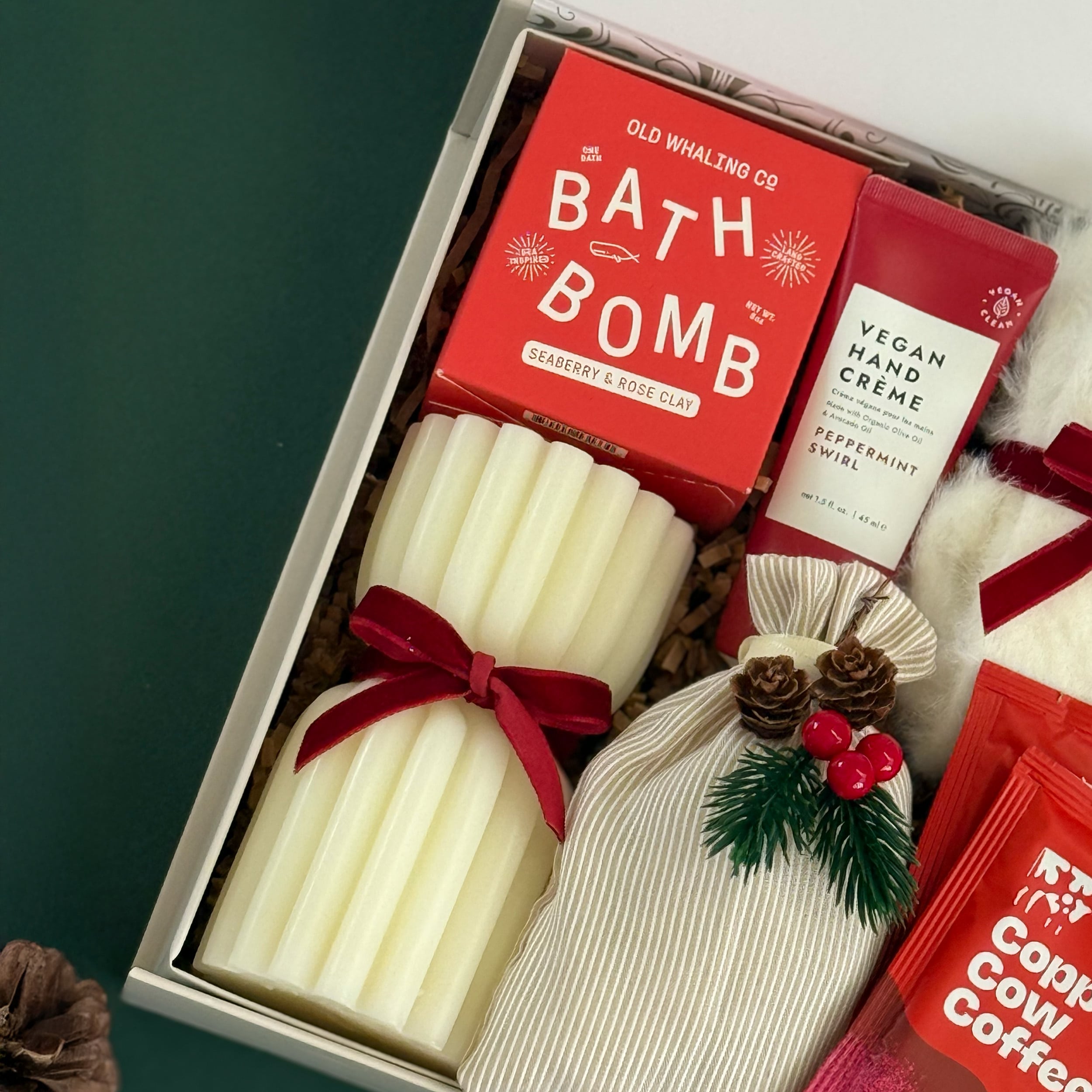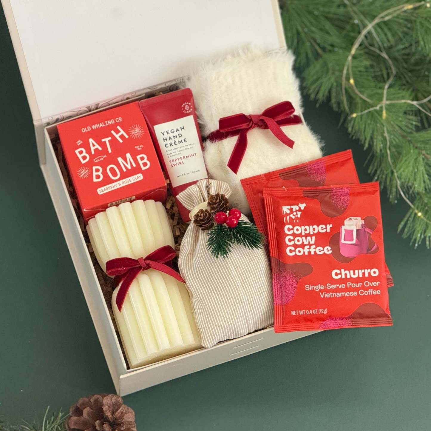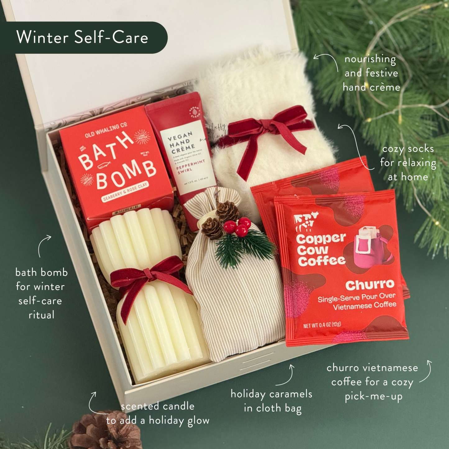 Refresh, relax, and cozy up with the Winter Self-Care Gift Box �� a festive self-care set designed to bring warmth and cheer to winter days. Curated in vibrant holiday red with touches of natural texture, this box includes everything needed for a soothing and energizing break. Featuring rich churro-flavored Vietnamese pour-over coffee, a peppermint hand cr��me, a sea-inspired bath bomb, and a ribbed pillar candle for soft light, it creates a perfect moment of seasonal calm. Fuzzy socks and a bag of buttery caramels complete this comforting, gift-ready ensemble that celebrates the cozy joy of the holidays.